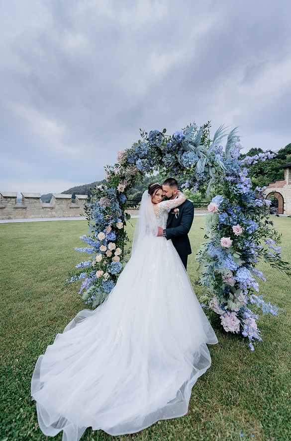 Tối giản, hiện đại với tông trắng – xanh, phù hợp với tiệc cưới trẻ trung hoặc hội nghị doanh nghiệp.